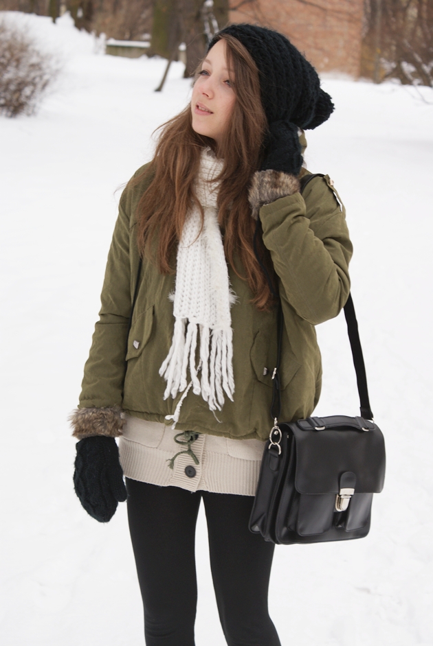 W dzisiejszym poście przedstawiam wam NAJCIEPLEJSZE buty jakie kiedykolwiek miałam. W żadnym procencie nie dorównują im emu. Oprócz tego, że są ciepluśkie, to mają świetny wygląd – są tak futrzaste niczym moje koty oraz mają antypoślizgową podeszwę. Przejdźmy do całości, która została wymyślona przy okazji wczorajszego kuligu klasowego. 🙂 Kurteczka to nowość w mojej szafie, podobnie jak buty jest strasznie ciepła, w środku cała jest wyłożona białym puszkiem, który w dotyku jest mięciutki jak misio 😀 Torebka, którą widzicie zapewne jest wam znana – mam taką samą tylko w innym kolorze, tak mi się spodobała, że stwierdziłam, że przyda się druga na zmianę (służą mi do targania książek). Przypominam, że jeśli macie jakieś pytania to bardzo chętnie odpowiem w komentarzu 🙂
